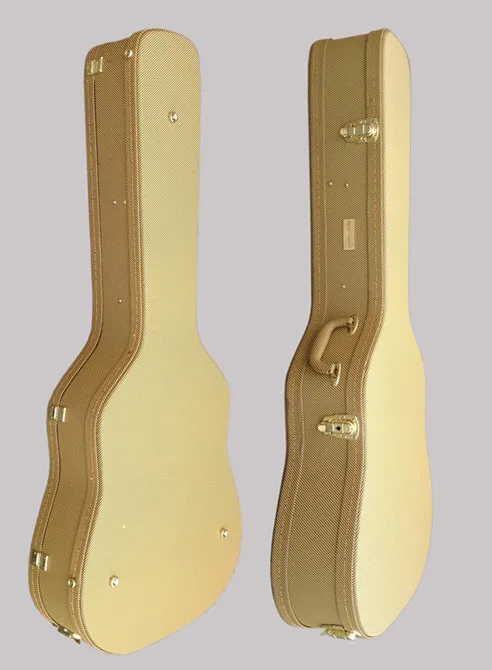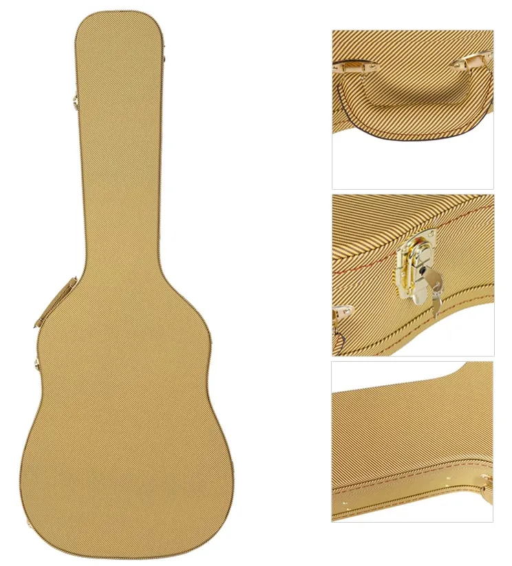 This 41-inch acoustic guitar wooden hard case features a rigid wood shell combined with a classic tweed-style exterior, offering both professional-level protection and a distinctive vintage appearance. The solid wooden construction protects the guitar from impact, pressure, and external damage during transport and storage.