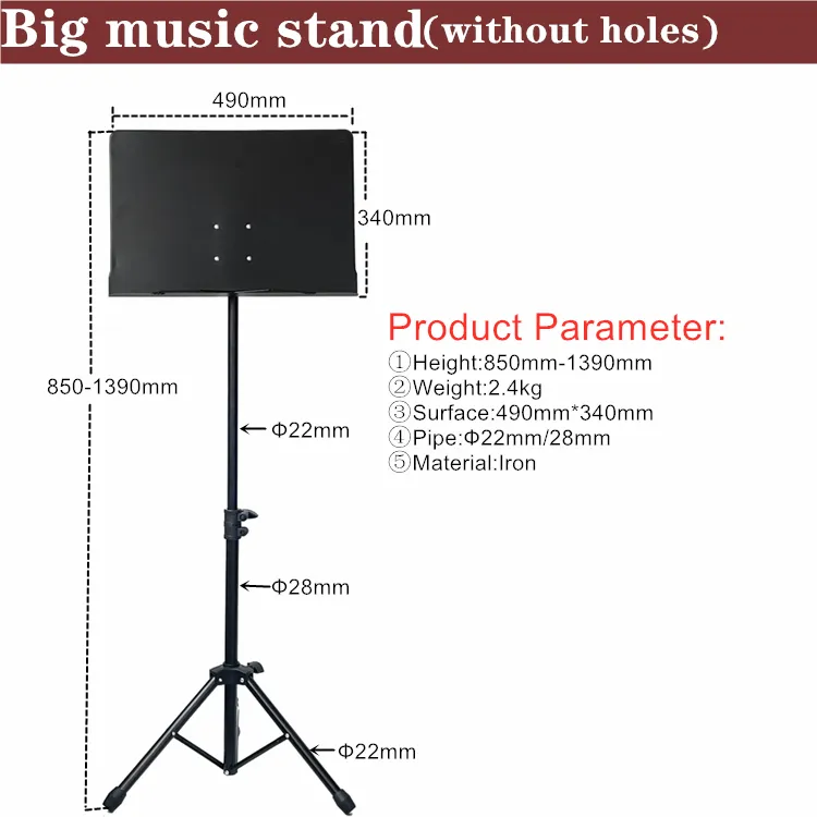 This big music stand features a solid sheet plate without perforation, providing a clean and uninterrupted surface for sheet music, books, and folders.