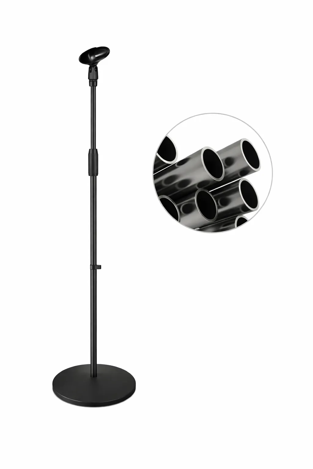 An upgraded entry-level microphone stand featuring reinforced steel tubes and a 25cm metal base for improved stability, ideal for daily practice, home studios, and light stage use.