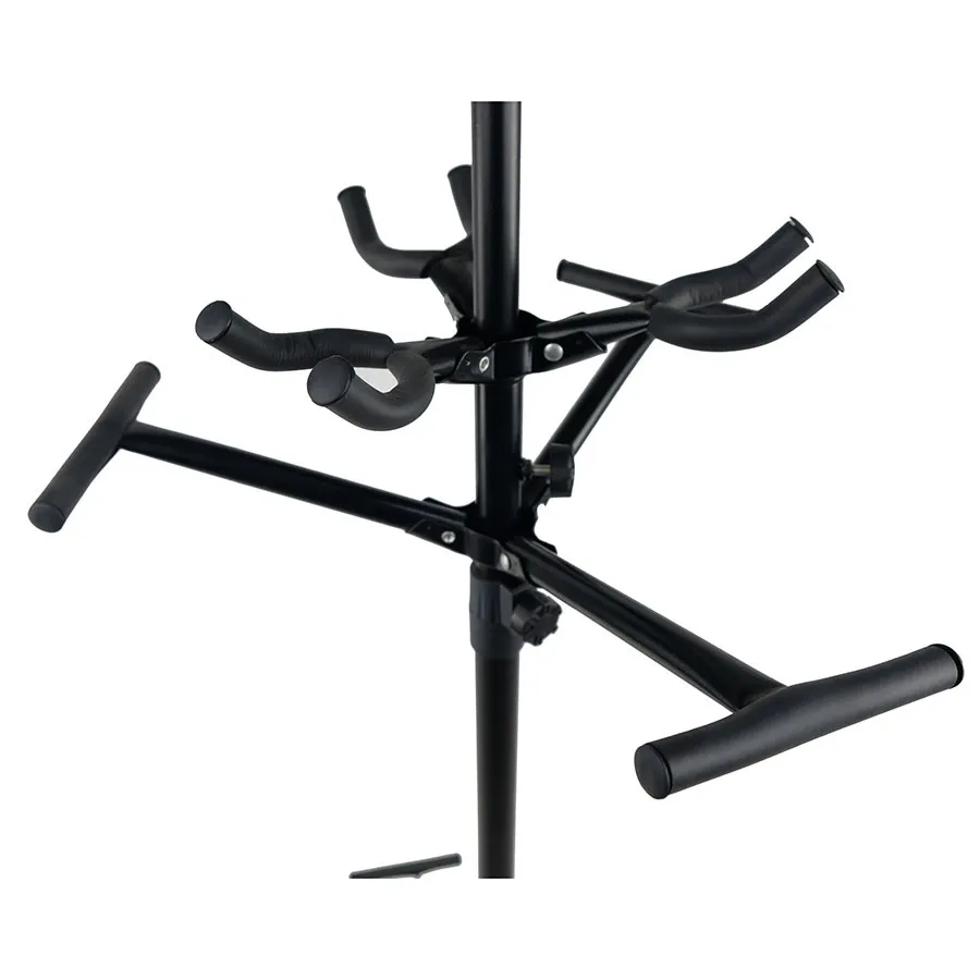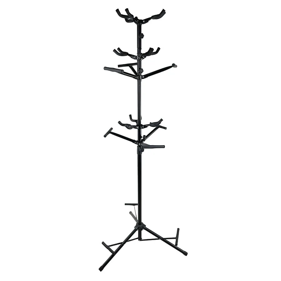 This vertical multi-instrument stand is designed to securely display and store up to 3 ukuleles and 6 guitars in a single floor-standing structure.