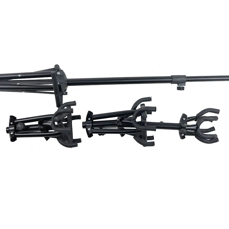 Different-sized support arms are arranged on multiple levels, allowing ukuleles and guitars to be placed separately while keeping each instrument stable and easy to access.